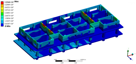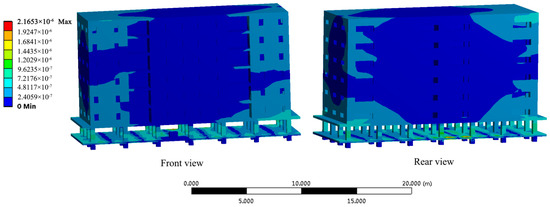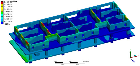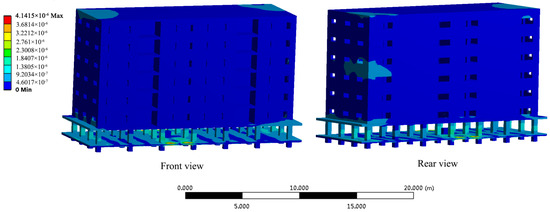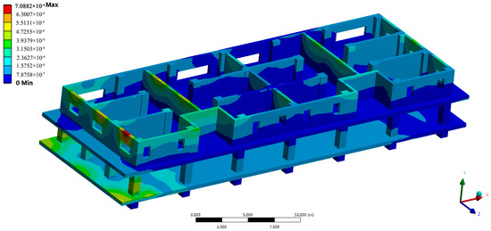 The vibration’s propagation law through the whole building will be different from that indoors. Taking the transformer that is at position #3 as an example, the vibration displacement nephogram is shown in Figure 27 under the condition that the same excitation is applied to the transformer.
