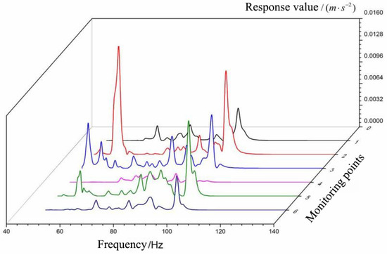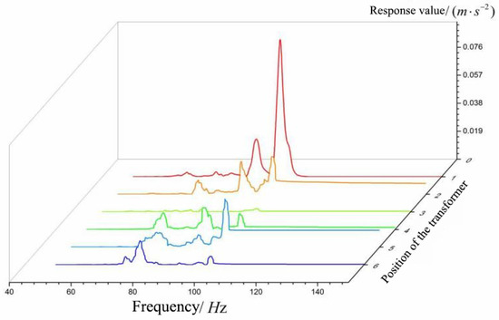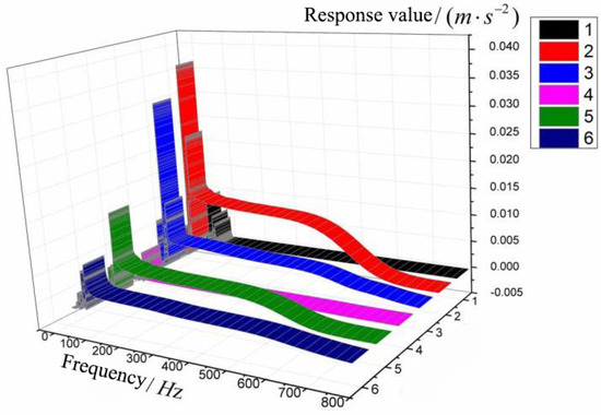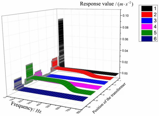 Considering that the vibrations in the three directions are almost of the same magnitude, and in practice, the vibration of the transformer is mainly up and down [19], when the excitation is applied, only the vibration in the Y direction will be analyzed. The transformer’s position remains unchanged, and the response curve of 1–6 test points at the front side is shown in Figure 16.