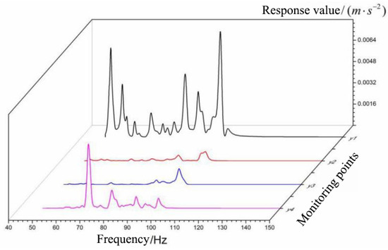 The response spectrum is mainly around 100 Hz, and the response spectrum at high frequencies can be negligible. In order to dramatically display the result, the data should be filtered, only considering the value within 150 Hz, and adjusting the X-coordinate. The corresponding response spectrum curve is shown in Figure 15.