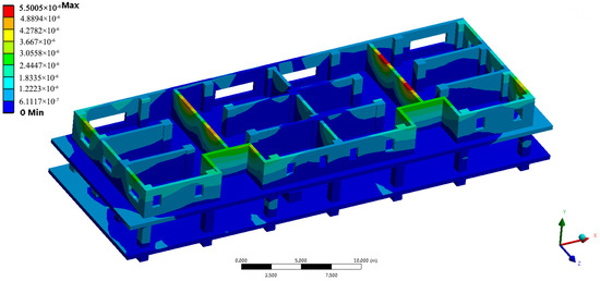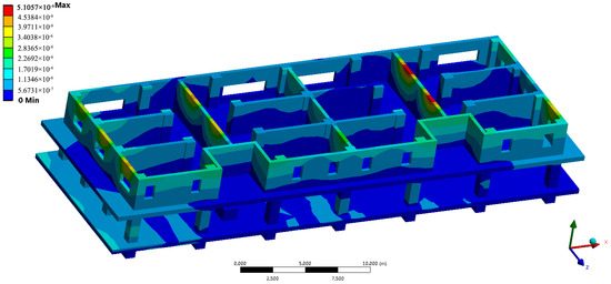 As is shown in the above nephograms, the effect of transformer’s vibration on the structure of the two-layer model will be different due to different placement of the transformer under the same excitation. From Figure 13 and Figure 18, Figure 19, Figure 20, Figure 21 and Figure 22, it is not difficult to find that the position of the maximum amplitude has changed. When the transformer is successively placed at position #1, #2, and #3, the influence of the vibration on the wall of the Z-direction at the center position is gradually increasing. When the transformer is placed at position #1, the displacement of the wall of the Z-direction at the center position is about 0–7.8758 × 10−7 m, while it is 5.9859 × 10−7–1.7958 × 10−6 m when the transformer is placed at position #2, and 0–1.9856 × 10−6 m when the transformer is placed at position #3. Through the simulation nephogram, when transformer is at position #3, which is just in the middle of the model, the impact of vibration on the house is the most extensive. The area achieves the maximum displacement 5.9568 × 10−6 m is relatively larger.