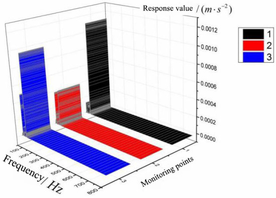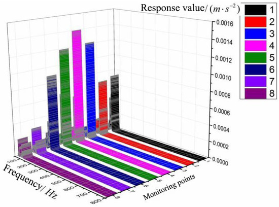 In detail, we can further obtain the response spectrum of the typical monitoring point. We use the frequency-acceleration curve to learn more about the vibration. In the range of 800 Hz, the response spectrum of vibration at point 1 is shown in Figure 14. The monitoring value can be shown in X, Y, Z directions.