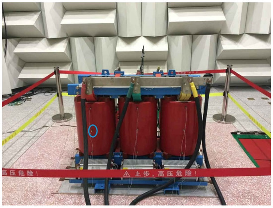 The model of the distribution transformer in the field test is SCB11-800/10 as shown in Figure 35 and Figure 36. The distribution transformer is placed in the anechoic chamber, and the probes are placed on the transformer such as the blue oval area in Figure 35 to measure its vibration. Besides, in the anechoic chamber a total of 12 sound sensors are suspended around the room to measure the sound.