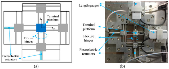 There are a wide variety of mechanisms such as compliant mechanism and parallel mechanism for high-precision positioning and motion technology [1,2,3]. Flexure-based compliant mechanisms, which transmit the motions entirely through the deformation of materials, exhibit the advantages of a typical micro-motion mechanism in terms of no backlash, no wear, and easy manufacturing [4]. Both serial and parallel structures have been adopted in flexure-based mechanisms, although most flexure-based stages are developed based on a parallel structure. This is due to the fact that parallel flexure-based stages have advantages of high rigidity and frequency, low inertia and symmetrical characteristics of each axis [5,6,7]. A piezoelectric actuator is usually adopted as the actuator of the flexure-based manipulator due to its merits of high-precision, fast response, high stiffness and large force [8]. However, some dynamical behaviors of micro-motion system are challenging from the perspective of control. In particular, there is inevitable model uncertainty and nonlinearity caused by cross-axis coupling effects, rigidity variation in addition to the hysteresis and other nonlinearity of the piezoelectric actuator [9,10], which will obviously deteriorate motion accuracy, especially in high-speed applications.