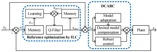 Figure 2 depicts the whole control structure of LODCARC for flexure-based micro-motion stage to achieve ultra-high precision motion. The DCARC term is designed based on the system dynamics that aim to achieve parameter adaption and certain robustness, although in real-world practice with the complicated environment, there exists unavoidable tracking error, which is defined as e = x – xd. Furthermore, the unmodeled uncertainty and disturbance affecting the tracking performance of the micro-motion stage are repetitive, to a large extent. The ILC optimization term is treated as a trajectory optimization to alter the reference for DCARC. The optimal signal xopt of ILC is based on previous repetitive control information including tracking error e, which aims to compensate for the effects of unmolded repetitive uncertainty and disturbance. Thus, with reference optimization by ILC (Figure 2), the reference trajectory used for DCARC is adjusted as xa = xd + xopt, with the accuracy of the flexure-based micro-motion stage able to be further improved.