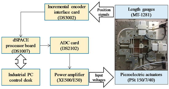 To validate the proposed control method, the comparative experiments were carried out on the flexure-based micro-motion manipulator as depicted in Figure 1, while the whole experimental system is established as depicted in Figure 3. The two actuators are controlled by a modular piezo-servo controller (XE500/E50, XMT Harbin, China). A dSPACE processor board DS1007 equipped with a 16-bit ADC card (DS2102) and a 6-channel high resolution incremental encoder interface card (DS3002) is utilized to output the excitation voltage of the piezo servo controller and capture the real-time data for the length gauges. Since the piezoelectric actuator is made up of multiple piezoelectric layers glued together, it is sensitive to the pulling force, which may bring damage to the actuator. Therefore, preloading forces were applied on the two piezoelectric actuators by tightening the bolts to guarantee their operational safety.