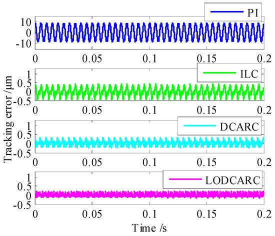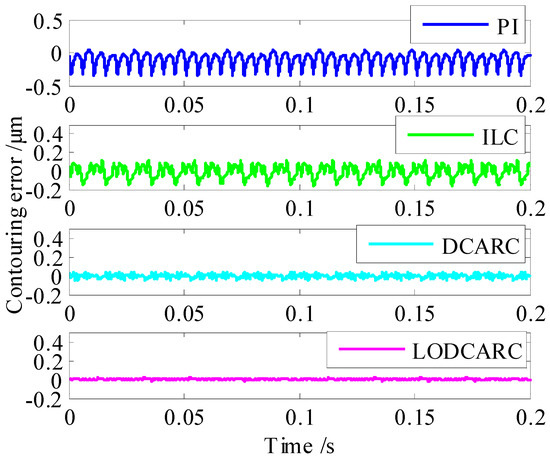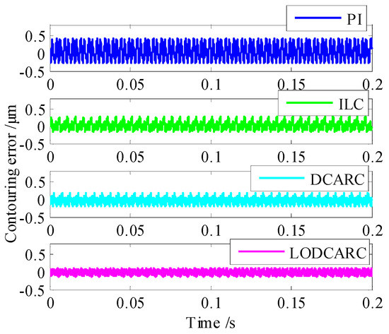 It is clearly demonstrated from Figure 5 that all controllers can achieve good contouring performance. According to the contouring errors of all four controllers plotted in Figure 6 and the performance indexes given in Table 2, the contouring error of the PI controller is much larger than that of the other three controllers, with the εRMS of PI controller being over 0.2 μm. The proposed LODCARC controller achieved an εRMS of 0.066, which is much smaller than the others. It can be subsequently obtained that the εRMS of the proposed LODCARC controller is 29% of the εRMS of PI controller, 56% of the εRMS of ILC controller and 69% of the εRMS of the DCARC controller. Furthermore, the εM of all four controllers illustrated in Table 2 also shows that the proposed LODCARC controller outperforms the other controllers with respect to contouring performance.