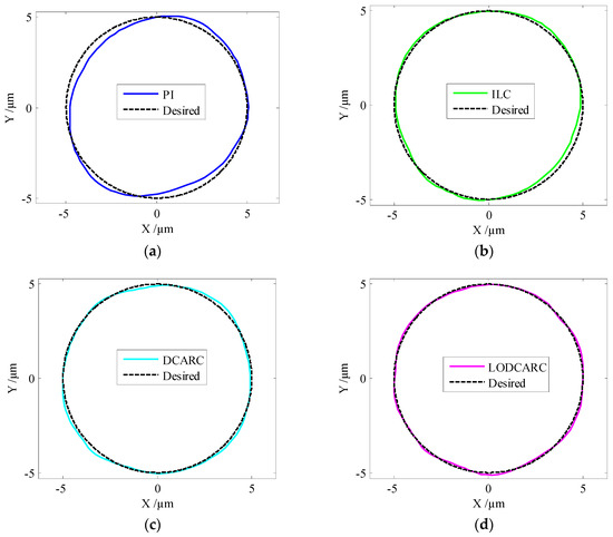 It can be observed from Figure 4 that the tracking performance of PI controller in the X-axis is the worst, due to the phase lag problem of PI controller under high-speed motion conditions. In comparison, the other controllers can achieve good tracking performances. However, the dynamics of the stage in X- and Y-axes are identical theoretically due to the symmetrical structure of the micro-motion stage. As a result, the phase lag in two directions is the same for the circular trajectory, which will lead to a relatively good contouring performance. As for the other three controllers, the eRMS of the ILC and DCARC controllers were above 0.13 μm, while the eRMS of the proposed LODCARC controller is around 0.08 μm. It also can be seen from the eM in Table 1 that the proposed LODCARC controller performs best.
