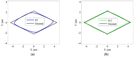 To validate the performance of the proposed control strategy sufficiently, a diamond-shaped contouring trajectory with a side length of 5 μm and a frequency of 50 Hz was also tested on the manipulator. For non-smooth trajectory, velocity planning is needed, and the S-shape curve [30] was adopted to plan the motion of each side of the diamond-shaped trajectory. Similarly, the contouring results during one motion period are shown in Figure 7, and the contouring errors over 0.2 s are given in Figure 8 while the corresponding performance indexes are compared in Table 3.