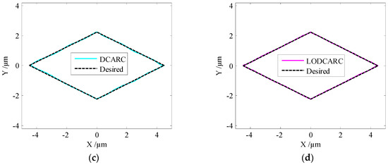 Contouring performances of diamond-shaped trajectory using (a) PI controller; (b) ILC controller; (c) DCARC controller; and (d) LODCARC controller.