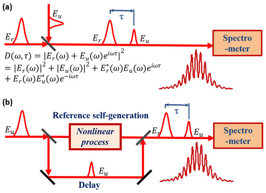 Nonlinear processes are required for most ultrashort-pulse measurements to perform time-gating in the sampling of short temporal segments of the pulses to be characterized [29,30,36,49]. This requirement increases the complexity of an ultrashort-pulse measurement system because of the need for suitable nonlinear media and relatively high peak power [49]. The use of a reference pulse with a known amplitude and phase in SI drastically simplifies the measurement with respect to the equipment needed and algorithm used [36,37]. The principle of SI is shown in Figure 1a. An unknown pulse and a reference pulse, separated by a suitable time delay τ, are collinearly guided into a spectrometer. A spectral interferogram that includes the phase information of both the reference and the unknown pulse is obtained and expressed as , where and are the spectra of the reference pulse and the unknown pulse and and are the spectral phase of the reference pulse and the unknown pulse. Fourier transform spectral interferometry (FTSI) is introduced into the SI process to determine the spectral phase of the pulse to be measured [36].
