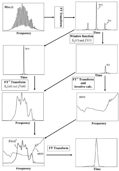 where is the sum of the spectral intensities of the reference and the unknown pulse and is the interference of the two spectra. The spectrum and spectral phase of the unknown pulse can be obtained using a Fourier transform-based procedure and an algebraic calculation, as outlined in the following steps and in Figure 2: