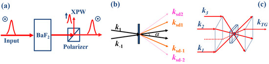 XPW, SD, and TG are all frequency-conserved four-wave-mixing processes that are used to improve the temporal contrast of ultrahigh-peak-power femtosecond laser systems [51,55,56]. The performances of the generated XPW wave, SD signal, and TG signal show that these processes satisfy the requirement as a reference pulse for the SRSI method. The principles of the XPW generation, SD, and TG processes are shown in Figure 3.