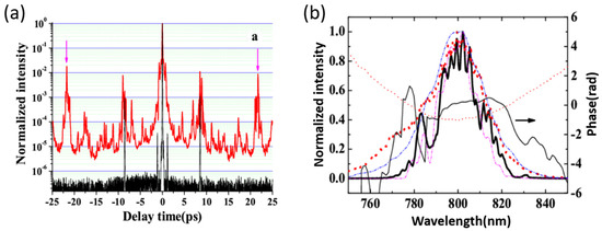 (a) Typical improvement in the temporal contrast of the reference pulse (black line) compared to that of the incident pulse (red line) during the SD process. (b) Typical spectrum and spectral phase of the reference pulse (red dotted lines) compared to that of the incident pulse (black solid lines) [55].