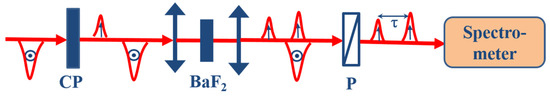 The XPW effect was the first third-order nonlinear process used in the SRSI method in which a single incident beam is used [31]. Figure 5 presents the principle of XPW-SRSI. In brief, a linear polarized unknown femtosecond laser beam passes through a calcite plate (CP) by which the polarization of a small fraction of the incident pulse becomes perpendicular with a time delay proportional to the thickness of the calcite plate. The incident pulse is then focused onto a BaF2 crystal to generate an XPW signal also with polarization perpendicular to that of the incident laser beam. Finally, a polarizer (P) separates the polarization-rotated incident pulse and the XPW signal. A spectrometer measures the spectral interference.