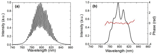 - After calculating the phase using , the preliminary spectral phase of the pulse to be measured is calculated using Equation (4):where and are the spectral phases of the test pulse and the reference pulse, respectively.