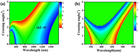 Two-dimensional phase-mismatch pattern plotted against the crossing angle and the probe wavelength when the pump wavelength was fixed at (a) 800 nm in a 0.1-mm-thick fused silica glass plate or (b) 400 nm in a 0.1-mm-thick CaF2 plate. The black solid line corresponds to zero phase mismatch [43].