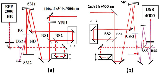 Experimental setup for SD-SRSI used to characterize a pulse at (a) 800 nm [VND, variable neutral density filter; BS1, BS2, and BS3, 50:50 1-mm-thick beamsplitters; SM1: spherical mirror with a radius of curvature R = −700 mm; FS: 0.1-mm-thick fused silica glass plate; ND: neutral density filter; SM2: spherical mirror with a radius of curvature R = −1000 mm; EPP-2000-HR: high-resolution spectrometer (~0.15 nm resolution around 800 nm)] and at (b) 400 nm [BS1, BS2, and BS3, 50:50 0.5-mm-thick beamsplitters; SM: spherical mirror with a radius of curvature R = −300 mm; CaF2: 0.1-mm-thick CaF2 plate; USB 4000: spectrometer (~1.5 nm resolution at 400 nm)] [43].
