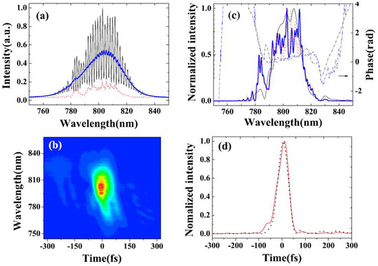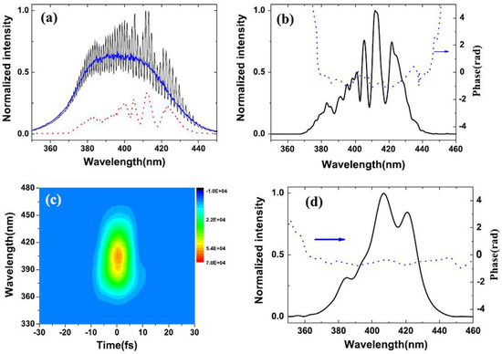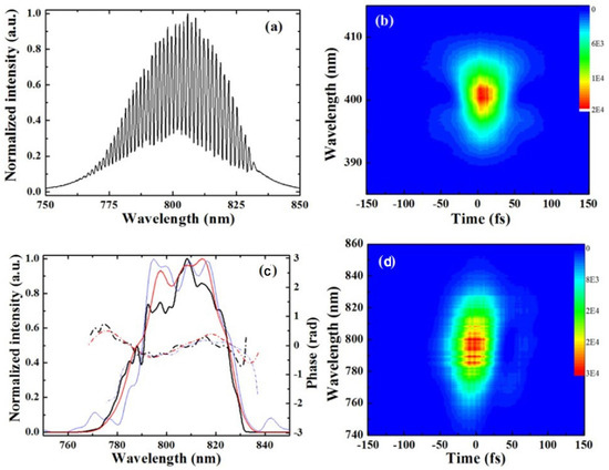 Figure 9 and Figure 10 show the results obtained using the setups displayed in Figure 8 at 800 and 400 nm, respectively. Figure 9a,b show the original data obtained in the experiment using SD-SRSI and SD-FROG, respectively, for a pulse at 800 nm. Figure 9c shows the resulting spectra and spectral phases of the test pulse obtained by SD-SRSI and SD-FROG, where the reconstructed spectrum obtained by SD-SRSI agrees well with the spectrum measured directly by the spectrometer; even the fine spectral modulation overlaps. Figure 9d shows that the reconstructed pulse profiles for both methods closely overlap, with a pulse duration of ~55 fs for both closed temporal profiles.