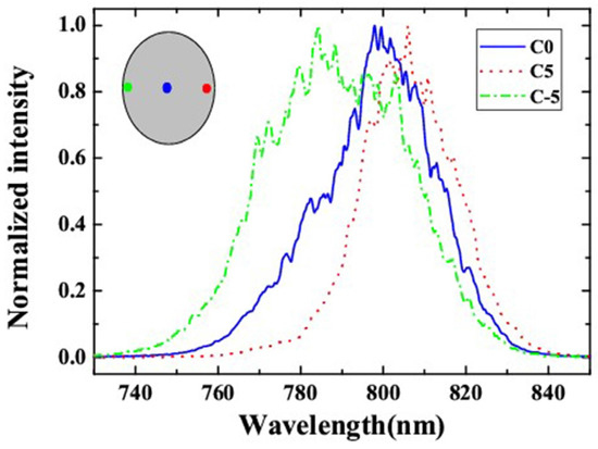 Experiments showed that the SD signal has an obvious angular chirp because SD is a non-collinear optical parametric process that needs to satisfy the phase-matching condition. Figure 11 shows a typical angular chirp of an SD signal. If a different part of the SD signal is selected for the reference pulse, its angular chirp makes the spectrum of the reference pulse different, which will introduce error into the measured result. This angular chirp is not easy to remove in the SD process.