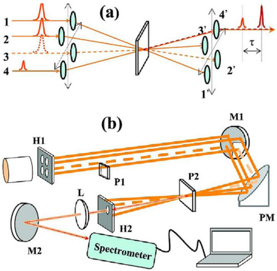 (a) Principle of TG-SRSI. (b) Experimental setup; H1: black plate; P1 and P2: fused silica plates; M1: plane mirror three-fourths silver-coated; PM: parabolic mirror; H2: iris; L: lens; M2: plane mirror [60].