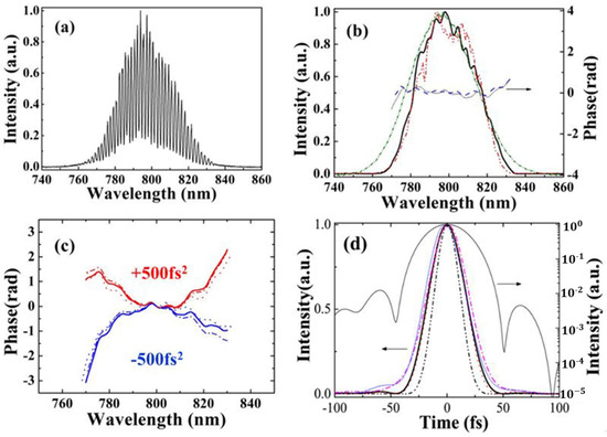 The original measured spectral interferogram obtained using the TG-SRSI setup is shown in Figure 14a. Figure 14b shows that the flat spectral phase, reconstructed on the basis of the spectral interferogram, overlapped well with the spectral phase obtained by Wizzler. To prove further the reliability of the TG-SRSI technique and setup, precise 500 fs2 and −500 fs2 group delay dispersions (GDDs), induced by a Dazzler ultrafast pulse shaper (FASTLITE), were added directly to the incident pulse. Figure 14c shows the chirped spectral phases of the testing pulse with the ±500 fs2 GDDs added as measured by TG-SRSI and Wizzler, and the calculated spectral phase obtained by adding ±500 fs2 GDD onto the flat phase in Figure 14b. The figure shows that all three spectral phases coincide. These results prove that TG-SRSI used in our simple setup can accurately characterize femtosecond pulses. Figure 14d shows the reconstructed temporal profiles of the testing pulse after adding 0, 500, and −500 fs2 GDDs to the incident pulse. The resulting pulse durations (hereafter referred to as mean FWHM) were 37.5, 42.1 and 42.6 fs, respectively, when the testing-pulse and the TG reference signal had the Fourier-transform-limited (FTL) pulse durations of 36.8 and 27.0 fs, respectively. Moreover, the temporal profile of the 37.5 fs testing pulse had a 50 dB dynamic range.