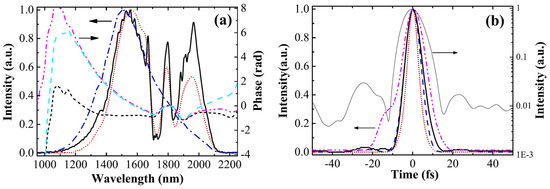In the TG-SRSI method, the nonlinear medium is an arbitrarily selected transparent plate. In principle, the TG-SRSI method can be used to characterize femtosecond pulses at other wavelengths by replacing the spectrometer with one suitable for the test pulse. To check the potential of the TG-SRSI method and our setup, a sub-10 fs pulse with a center wavelength of approximately 1.8 μm was tested using the setup shown in Figure 13b, where only the spectrometer was changed (NIR256-2.1, Ocean Optics, Dunedin, FL, USA). Figure 15 shows the results of the characterization experiment. The spectrum of the laser beam, measured directly by the spectrometer, was close in shape to that of the TG-SRSI-reconstructed spectrum, as seen in Figure 15a; the corresponding reconstructed spectral phase is also shown. Placing a 1-mm-thick fused silica plate at the Brewster angle before the setup for dispersion compensation obtained the shortest pulse of 10.6 fs, as shown in Figure 15b on linear and logarithmic scales. Because the spectral range of the NIR256-2.1 spectrometer is limited, a signal longer than 2.1 μm cannot be measured. It is not clear why the intensity of the longer-wavelength TG signal is always weak. The FTL pulse duration of the TG signal was 6.8 fs, which is much shorter than that of the testing pulse at 9.6 fs, as shown in Figure 15b. To investigate the reliability of the measurement, the 1-mm-thick fused silica plate was removed, inducing −55 fs2 and 250 fs3 dispersions at this wavelength to the pulse. Therefore, the pulse was broadened to 15.1 fs because of the uncompensated dispersion. The reconstructed spectral phase coincided with the calculated spectral phase, as seen in Figure 15a. This result clearly proves that the TG-SRSI method is capable of working and yielding reliable results in the mid-IR spectral region.