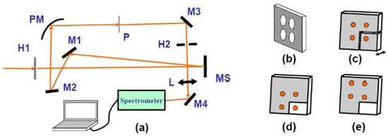 The experimental setup used to prove the capability of the FASI method in practical use is shown in Figure 16a. A variable neutral density filter is used to continuously change the incident pulse energy before entering the setup. A black plate (H1) with four equal-sized holes is used to separate the incident beam into four 2.5-mm-diameter beams. The four holes are arranged in a rectangle and form BOXCARS geometry. The four beams are introduced into a mirror set (MS) comprising an L-shaped mirror and a separate square mirror, which fits into the L-shaped mirror, as shown in Figure 16c. The square mirror, connected to a motorized stage (M-122, PI), introduces scanned or fixed delay for FROG or SRSI, respectively. The mirror set reflects the four beams to a specially designed mirror (M1), of which five-sixths of its area is silver-coated and one-sixth of the left part is not coated, as shown in Figure 16d,e. M1 is fixed on a manual stage that can be moved vertically. For TG-FROG measurements, M1 is moved down and all four beams are reflected by silver-coated part of the mirror, as shown in Figure 16e. For SHG-FROG or TG-FROG measurements, only two or three beams, respectively, are needed. For TG-SRSI measurements, M1 is moved up, and the beam reflected by the quarter mirror (Figure 16c) is reflected again by the uncoated part of M1 (Figure 16d). M1 reflects all the beams onto M2 at a reflective angle of ~50°. Using the Fresnel equation, the reflectivity of the uncoated part of M1 is calculated to be <0.3% for horizontally polarized light. Thus, the testing-pulse energy will be reduced to result in perfect spectral interference. M2 reflects the beams onto a silver-coated parabolic reflector (PM), with a focal length of 150 mm, which focuses all the beams onto a 500-μm-thick fused silica plate (P) to generate the TG signal. For SHG-FROG measurements, the upper two beams on M1 are blocked and the glass plate is replaced by a 50-μm-thick beta barium borate (BBO) crystal. For TG-SRSI measurements, the TG signal and the test beam are collinearly self-combined and pass through an iris (H2). For TG-FROG and SHG-FROG measurements, only the TG and the SHG signal, respectively, is selected by the iris. The selected signals are focused by a focal lens (L) onto a plane mirror (M4) before entering a spectrometer to acquire the original data.