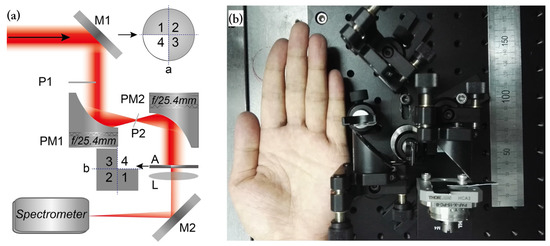 Setup of enhanced TG-SRSI. (a) M1, special three-fourths-coated reflective mirror; P1, 0.5-mm-thick fused silica plate; PM1 and PM2, 90° off-axis parabolic aluminum mirrors, f = 25.4 mm; P2, 0.15-mm-thick YAG plate; A, aperture; L, lens, f = 200 mm; M2, reflective mirror; inset a, the front side of M1; inset b, the shape of A. (b) Photo of the optical setup of the device [63].