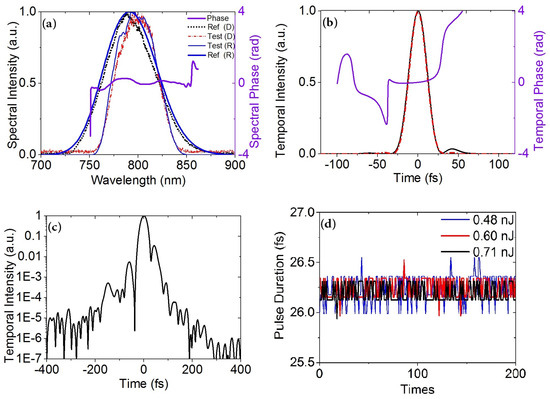 Figure 19 presents the results of measuring 0.48, 0.60, and 0.71 nJ pulses with the enhanced TG-SRSI. The reconstructed spectra and the spectra directly measured by the spectrometer match very well, as seen in Figure 19a. The spectrum of the self-created reference pulse is broader and smoother than that of the input unknown pulse, which proves the reliability of measurements obtained with this setup. Figure 19b shows the reconstructed temporal profile and phase of the 0.48 nJ input unknown pulse, which had a pulse duration of about 26.3 fs. The reconstructed temporal profile on a logarithmic scale (Figure 19c) shows a 50 dB dynamic range on a ±400 fs temporal range. Figure 19d shows the fluctuation in pulse duration in the characterization results for 0.48, 0.60, and 0.71 nJ pulses. Each curve consists of 200 measured results. The results presented in Figure 19 prove the reliability of the pulse characterization measurements obtained with the enhanced TG-SRSI setup, even at pulse energies <0.5 nJ per incident pulse. Thus, we succeeded in extending the TG-SRSI method for use in characterizing sub-nanojoule pulses.