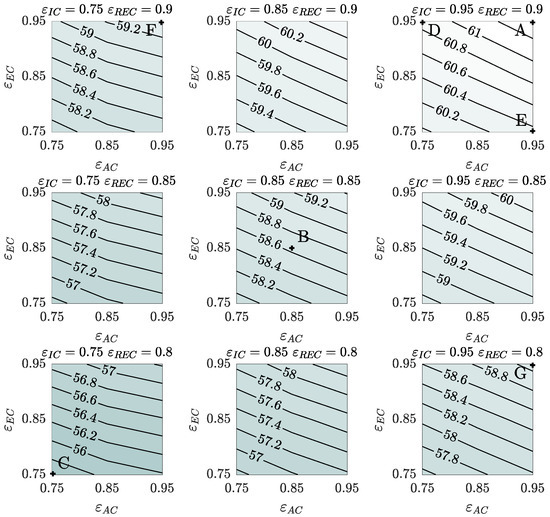 The impact of heat exchanger effectiveness on the cycle thermal efficiency is shown in Figure 3, for constant OPR of 40 and pinch temperature difference in the saturator of 5 K. The x-axis and y-axis of the contour plots are, respectively, the aftercooler and economizer effectiveness, and the contour lines show the estimated cycle thermal efficiency. Moving vertically and horizontally through the contour plots, the effectiveness of the recuperator and intercooler vary respectively. Therefore, the top-right point of the top-right contour corresponds to the cycle shown in Table 4.