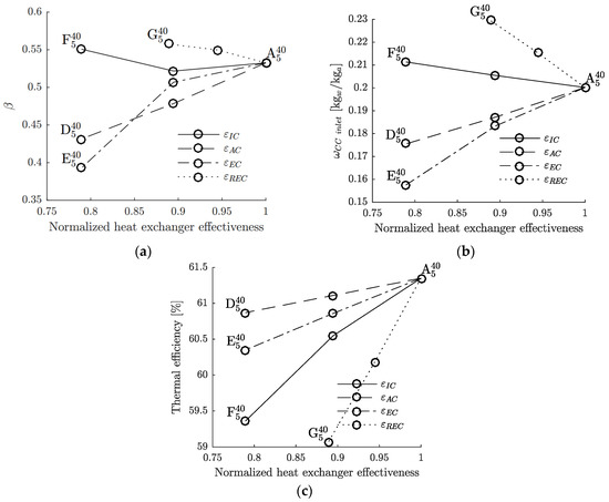 The recuperator is the heat exchanger whose effectiveness change has the most severe effects on the thermal efficiency of the cycle, with a reduction of 2.28 pp in thermal efficiency when it is reduced to 0.8 from 0.9 (→—see Figure 5), due to the reduction of high quality heat recovery—i.e., heat recovery at high temperature—within the cycle. Nevertheless, this reduction in recuperator effectiveness results in higher enthalpy gas at the inlet of the economizer and entails 22% higher amount of heat transfer in the latter heat exchanger. Therefore, the water mass flow injected into the saturator increases by 10%, the mass flow ratio of gas that bypasses the saturator decreases—i.e., increases by 4.7% as shown in Figure 5a—and the humidity at the inlet of the combustion chamber increases from 20% to 23% (Figure 5b).