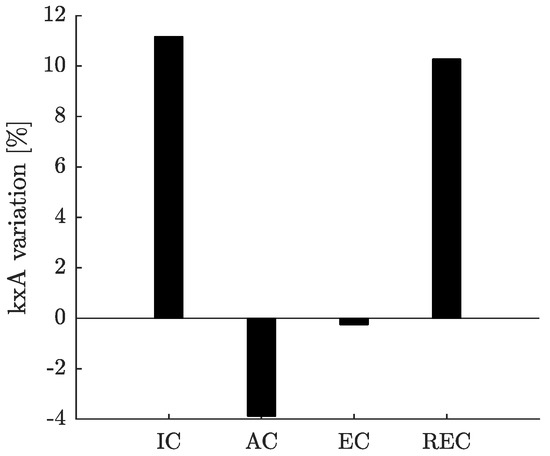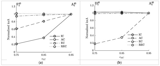 The heat exchangers that are mostly affected by the reduction in effectiveness are the intercooler and aftercooler, with a reduction of k × A respectively of 79% (→—see Figure 6a) and of 82% (→—see Figure 6b) in relative terms when reducing the effectiveness of the latter from 0.95 to 0.75.