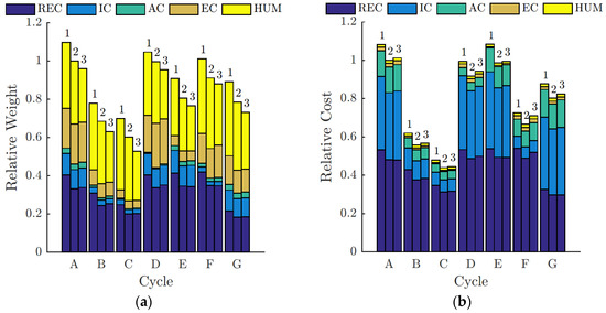 For cycle , the recuperator is the heaviest component—33.12% of the total weight—followed by the humidifier, the economizer, the intercooler, and finally the aftercooler—with relative contributions to the overall power plant weight of 33.01%, 20.96%, 9.98%, 2.94%, respectively. Although the economizer and the humidifier are among the heaviest components, their contribution to the overall cost of the system was found to be approximately 3% (Figure 9). In terms of heat exchanger cost, the recuperator is the most expensive heat exchanger—48.11% of the total cost, followed by the intercooler, the aftercooler, the economizer, and finally the saturator—with relative contributions to the overall cycle cost of 34.95%, 13.43%, 1.99%, and 1.52%, respectively.