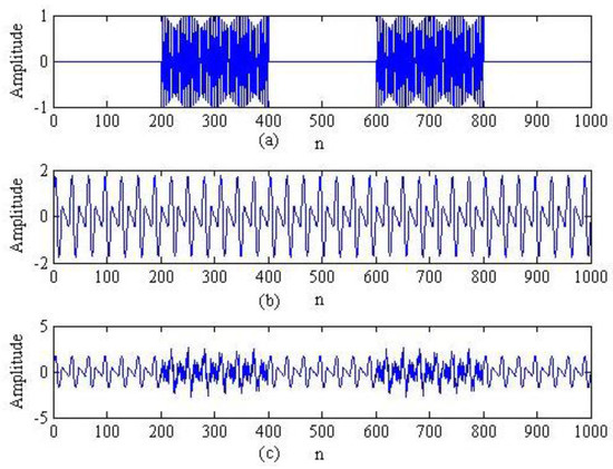 The simulation signal: (a) original intermittent harmonic signal; (b) modulating pure signal; (c) compound signal.