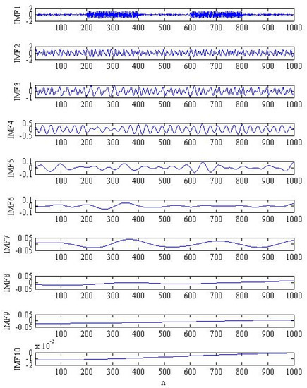 where , and . The mixed simulation signal is plotted in Figure 1. Table 1 shows the parameter selection for EEMD.