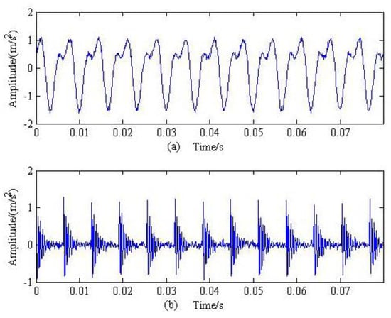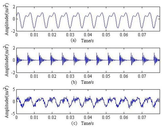 where the mesh frequency is set as Hz. Meanwhile, the inner race fault model is examined according to Equation (12), with the parameter selection being listed in Table 2. Furthermore, the noise components cannot be neglected and they can be defined as additive white Gaussian noise, whose variance is 0.5 and average is 0.