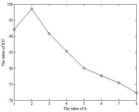 where are the principal eigenvalues in descending order, while is the characteristic values for noise. Commonly, there is often clear distinction of the characteristic value between the noise components and useful signals. Therefore, for an accurate estimation of the covariance matrix and under the premise that the noise variance is relatively small, the dimensions of noise subspace of can be determined through judging the feature eigenvalue. Thus, the number of source signals can be obtained theoretically. However, it is difficult to determine the threshold value of the main characteristic value and the noise characteristic value. Therefore, the dimension of the noise subspace cannot be judged accurately. In order to solve the problem of threshold setting, the Bayesian information criterion (BIC) is employed to estimate the dimensions of the source signal and the noise subspace. BIC establishes the method of source number estimation based on the Bayesian Minaka selection model [41]. Thus, the BIC model can be approximately expressed as