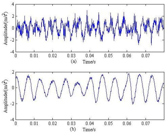 Since the IMF2 has the maximum correlation with the original signal, it can be chosen as the preferred mode component and is used together with the original single-channel signal to form . It is employed as a new multi-channel observation signal to achieve the blind source separation by the approach of feature matrix joint diagonalization, based on the four-order accumulation. The results provided by the proposed method are plotted in Figure 8. When comparing Figure 4 and Figure 8, it was found that the time-domain waveform of the two components obtained by the proposed method corresponds well with the original source signals.