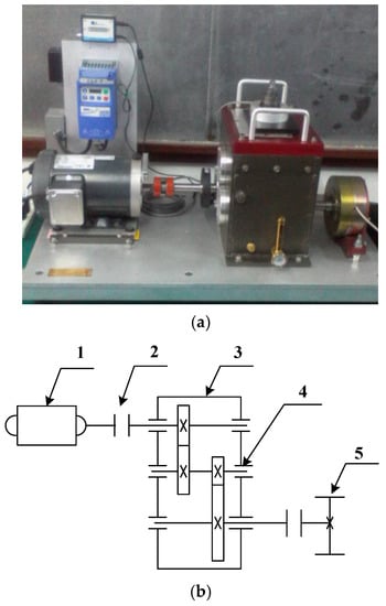 Fault simulation experimental table for the rolling-bearing of a gear box. (a) The physical map of the test rig; (b) The structure diagram of the test rig: 1-motor, 2-encoder, 3-gearbox, 4-measured point and 5-load device.