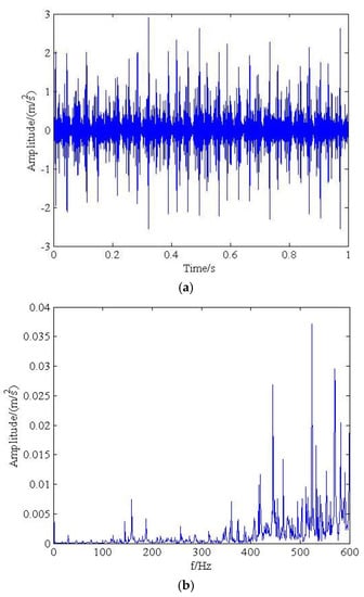 Time domain and frequency spectrum of a single channel composite signal. (a) The time response of a measured single channel vibration signal; (b) The frequency domain of measured single channel vibration signal.