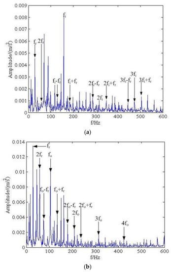 Figure 12a,b present the frequency spectrum of the estimated signal by the proposed method. From Figure 12a, the rotating frequency and its double frequency can be inspected. In addition, the inner ring fault frequency , its double frequency and its third harmonic frequency can also be identified. Moreover, the modulation phenomenon is rather obvious, which can further prove the inner fault of roll-bearing. Analogously, the outer ring fault frequency , its double and triple frequencies can also be found in Figure 12b. Therefore, the method proposed in this paper can accurately identify the fault frequency of the inner ring and the outer ring, which achieves the blind source separation of a multi-fault composite signal in the experimental table.