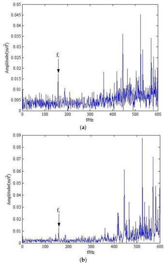 In this paper, the deep-groove ball bearing ER-16k (FAFNIR, Springfield, MA, USA) with faults on the outer and inner rings was simulated. According to the bearing parameters and the coefficient of the gear transmission ratio, the frequency of the inner ring and the outer ring of the bearing fault were calculated, which are listed in Table 3.
