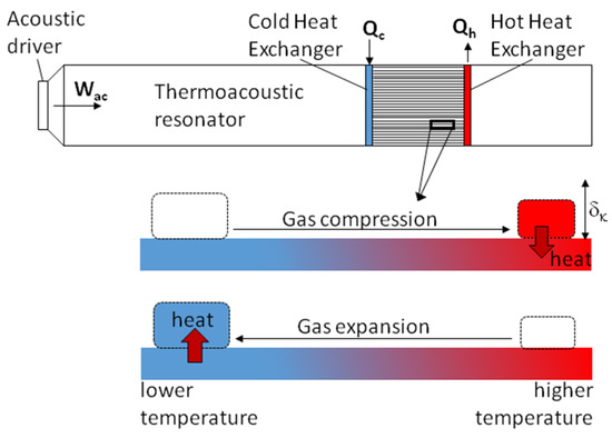 Thermoacoustic systems are usually divided into engines and refrigerators depending on the direction of energy conversion between the acoustic and thermal energy. The working principle of the thermoacoustic refrigerator is illustrated in Figure 1. The acoustic driver at the end of the resonator supplies acoustic power, , to the working gas inside the resonator. The standing wave acoustic field induces oscillatory motion of “gas parcels” coupled with their cyclic compression and expansion. Internal structures such as heat exchangers and stacks are placed at a location where the oscillating pressure and velocity are non-zero. A fragment of a single stack plate has been magnified at the bottom of Figure 1 together with a gas parcel undergoing an acoustic oscillation. The gas parcel is compressed as it moves to the right and the parcel temperature increases to be slightly higher than the plate temperature. Consequently, heat is being transferred from the parcel to the plate. As the flow reverses, the gas parcel expands and the temperature drops slightly lower than that of the plate. As a result, heat is being absorbed from the plate and the parcel returns to its original thermodynamic state. This completes the thermodynamic cycle. In essence, the acoustic wave provides power that allows the heat to be pumped up the temperature gradient. Conversely, if a high enough temperature gradient is imposed across the stack/regenerator, an acoustic power will be self-excited and useful energy will be produced [1]. This in turn could be extracted by a linear alternator to produce electricity, or used to drive a coupled thermoacoustic cooler.