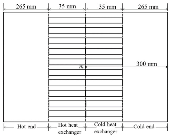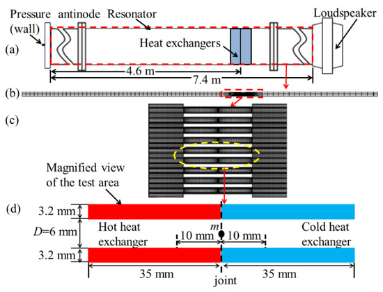 The plates of the hot and cold heat exchangers (subsequently denoted as HHX for “hot heat exchanger” and CHX for “cold heat exchanger” throughout the paper) have thickness, , of 3 mm and are arranged in a parallel configuration with the spacing, , of 6 mm between them. This is shown in Figure 2d as a magnified view of a single channel between a pair of hot and cold plates; point ‘m’ is the location of the joint where the hot and cold plates meet. The HHX and CHX are located next to each other with a joint positioned at from the pressure antinode. The wavelength, , is defined as , where is the speed of sound and is the frequency of the flow (13.1 Hz). Location of the pressure antinode for this 1/4-wavelength rig is at the end wall—cf. Figure 2a. The arrangement of the heat exchanger plates (10 pairs) follows the physical setup with five pairs of heated/cooled fins and five pairs of unheated ones, treated as adiabatic plates. The unheated plates provide consistent porosities for the flow (cf., [17]).