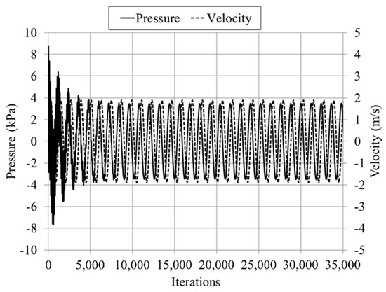 A first order implicit scheme is used for the discretisation of time due to the presence of the moving wall [12]. The momentum and energy equations are discretised using a second order upwind scheme with the convergence set to the absolute values of 1 × 10−4 for the continuity and momentum equation, and 1 × 10−7 for energy equation. The density is calculated using the second order upwind numerical scheme. Density is related to pressure and temperature by using the equation of state as shown in Equation (5). The transient solution of the flow problem is solved in a segregated way using the pressure-based solver [12,25]. The time step size was chosen so that solution converged within 15 to 18 iterations in every time step. If the time step size was too large, the solution was found not to converge in every time step. If the size was too small, convergence occurred too fast within a certain time step (sometimes only requiring one iteration in one time step). The best time step for convergence was determined and set at 1200 steps per acoustic cycle. The area-weighted-average of pressure at the end wall, known as the pressure antinode, was monitored until a steady state oscillatory flow was obtained. This is defined as a state when pressure, velocity, and temperature do not change much from cycle to cycle. By way of example, Figure 4 shows the history of oscillating pressure and velocity monitored for location “m” as defined in Figure 2. A steady oscillatory flow condition is achieved after six flow cycles. However, as will be discussed later, results presented in this paper are obtained after 70 flow cycles, when both the flow and thermal oscillatory flow conditions have reached a steady oscillatory state. The solutions are also monitored so that they converge in every time step at every flow cycle (through the selection of the time step size).