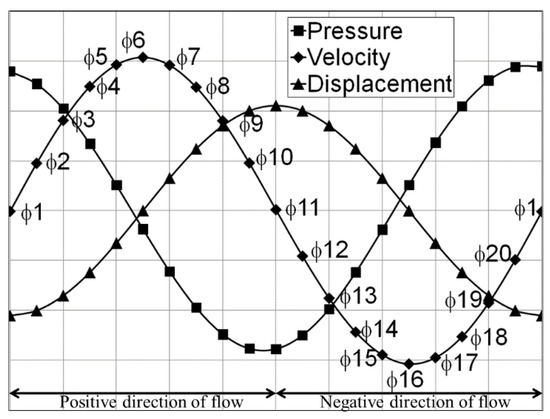 When the steady oscillatory state condition is reached, the model is validated and used for analysis. In this study, the development of flow within one oscillatory cycle is investigated according to the time frame defined in Figure 5. The cycle is subdivided into twenty phases starting from the first phase, 1. The relationship between pressure, velocity, and gas displacement, for the 20 phases of a flow cycle is illustrated. Phase 1 is set for the maximum value of the oscillating pressure at the location of the pressure antinode (rigid wall of the resonator). The period of one cycle is the inverse of the operating frequency—13.1 Hz.