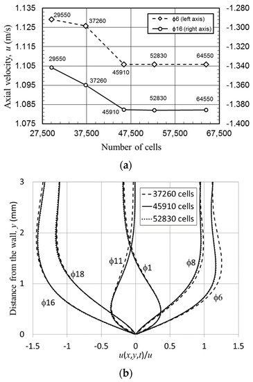 The grid independency tests are illustrated in Figure 6. In essence, the mesh was progressively refined in the part of the domain surrounding the heat exchangers (there was practically no need to do this in an empty resonator). The description of mesh density is given as cell counts in Figure 6a for five cases. Here, the velocity values at point “m” for phases 6 and 16 are taken as test variables (+ve and −ve values due to the change of direction). Similarly, the resulting axial velocity profiles (from the wall to channel centre), for selected phases in the cycle are further illustrated in Figure 6b. For clarity, velocity profiles are shown only for three cell counts. At low mesh density, the velocity profile is slightly over-predicted at all 6 phases shown. The velocity within the boundary layer appears to be the same for all cases because the mesh is always designed to be denser in that area. It is found that the model with a total of 45,910 cells is sufficient to provide a grid-independent solution.