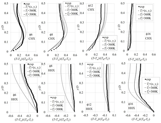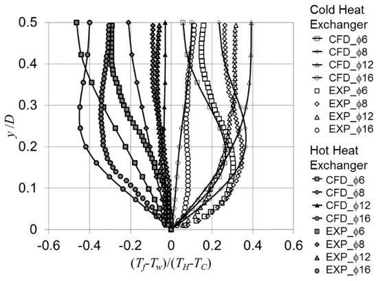 Temperature profiles for HHX and CHX—comparison between experimental (EXP) and computational (CFD) results at the location 15 mm from the joint (above the HHX and CHX plates).