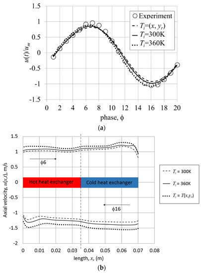 Figure 10 shows the effect of initial temperatures on the velocity amplitudes at a location 1 mm away from the joint above the cold plate. Evidently, a higher mean temperature of 360 K results in a slightly higher amplitude of the velocity, especially during the second half of the cycle. This may suggest that the experimental temperature field is affected by the accumulation of heat within the investigated area since raising the initial temperature from 300 to 360 K brings the solution closer to the experimental results. The same observation can be made for all locations along the heat exchanger plate as illustrated in Figure 10b. The velocity amplitudes at 6 and 16 shown in Figure 10b represent the highest velocity amplitude during the first and second parts of the flow cycle. The velocity amplitude for the model initialised at 360 K is always higher than the other two models for all the locations along the heat exchanger plate.