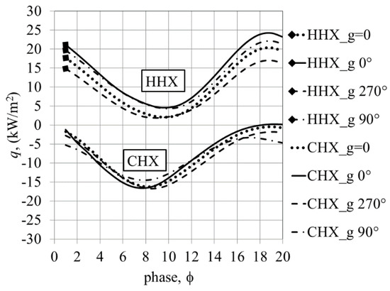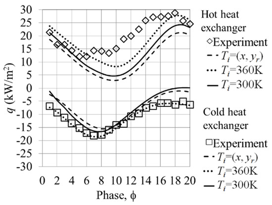 Finally, the effect of initial temperature on the heat flux is shown in Figure 11. Here, the heat flux is spatially averaged over the length of the heat exchanger (the same way as in [8]), and is presented as a function of time (phase in the cycle):